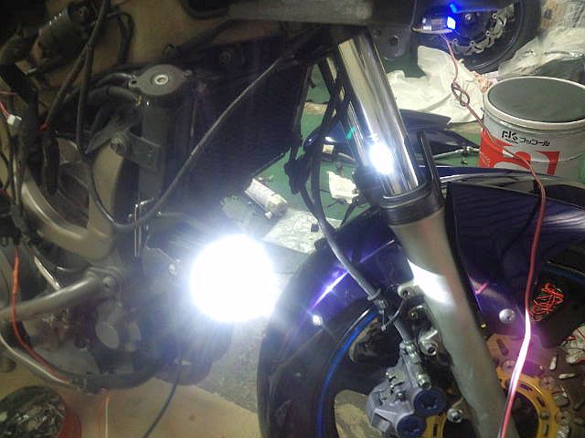 ので、半円ブラケットの前側だけ利用し、部材を駆使して従来通りラジエター脇に配置。HIDフォグの本体とコントロールユニットは取り外し、リレーからの給電ハーネスに件の防水カプラーを接続し、何故かギボシwのLEDフォグランプもコレと接続して完成。