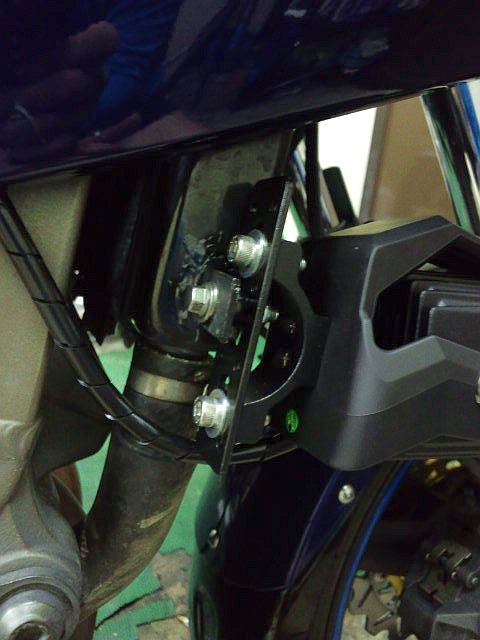 取り付けには、パイプにクランプさせる円形ブラケット大小しかない、、、、、、 隅立四目結の形の座金に四個ネジ穴があって、その二個を使って縦でも横にも出来るのだが、エンジンガードに取りつけると転倒時に確実に接地するし、フロントフォークにクランプさせるのはアッパーカウルの無い完全なネイキッドモデル等でなければ不可能。